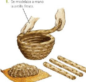 En el caso de la cerámica, grosso modo, hay tres maneras de fabricarlas, requiriendo para ello arcilla y desgrasante. La primera parte de colocar una masa de barro apoyada en el suelo y comenzar a conformar con las manos para ir dando a las formas, que en una primera fase son muy simples. La segunda es hacer un hueco en el suelo, donde se apoya, y a partir de ahí se construye el resto. Y la tercera es la denominada fórmula de cordones. Se hace una masa inicial de base. A partir de ahí, se hacen una serie de cordones («churros») para proceder al montaje de la pieza.