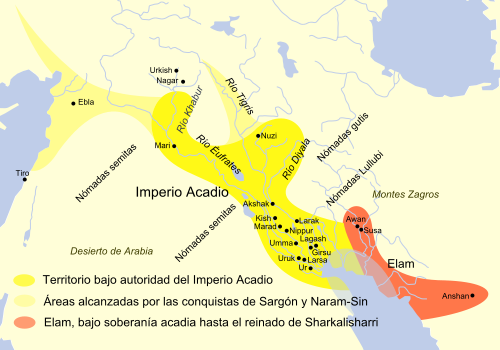 El Imperio acadio, también llamado Periodo de Akkad, es una fase del Bronce Antiguo en la Baja Mesopotamia que comprende aproximadamente entre el 2350 y el 2335 a.C. Cuenta con una única dinastía de origen acadio de la que hay que destacar principalmente a dos monarcas: Sargón de Akkad, primer rey de la dinastía (2335-2279 a.C.); y Naram Sin, cuarto rey de la dinastía (2254-2218 a.C.). En esta entrada vamos a ver cómo se forjó y se mantuvo a lo largo del tiempo uno de los primeros imperios de la Historia de la Humanidad.