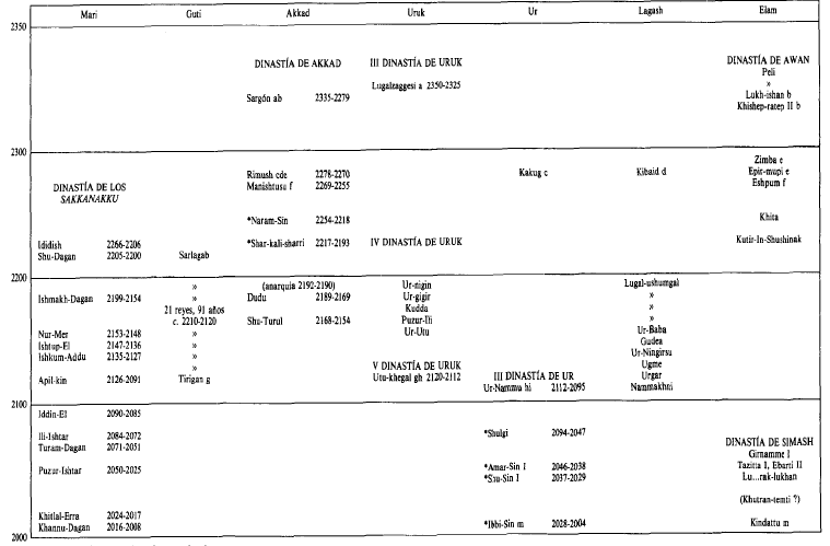 Después de Naram Sin, el imperio acadio entra en decadencia, comenzando a reducir su extensión territorial con su hijo y sucesor, Shar-Kali-Sharri (2217-2193 a.C.). De este largo reinado sabemos que luchó contra Elam, pero más a la defensiva que a la ofensiva. Tal y como veremos más adelante, después del bisnieto de Sargón se inicia un periodo de inestabilidad en el poder, hecho que una tribu conocida como los Guti aprovechará para someter al imperio acadio e instaurar su dominio en la Baja Mesopotamia durante un siglo.