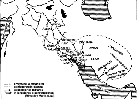 Rimush, primer hijo de Sargón de Akkad, es el sucesor de Sargón y por tanto segundo monarca del imperio acadio. De su corto reinado (2278-2270 a.C.) podemos destacar, por ejemplo, la dura represión que llevó a cabo contra las ciudades que se rebelaron tras la muerte de su padre, como Ur, Lagash, Umma o Kazallu. Una vez apaciguada esta situación, Rimush se dedica a cumplir lo mejor que puede la herencia de su padre, enfrentándose directamente contra Elam y sus aliados. Aunque a su muerte el problema no está solucionado, en las fuentes proclama que ya ha conquistado ese territorio.
