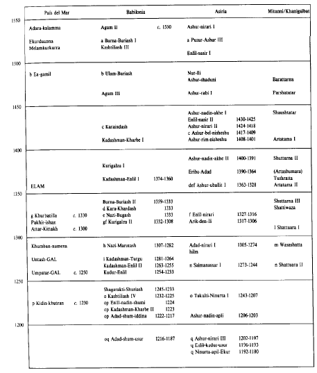 Por el contrario, la Babilonia casita se va a llevar mucho peor con Asiria: al no poder conseguir una princesa egipcia, el rey babilonio Burna-Buriash II (10º rey, aprox. 1359-1333 a.C.) acepta de buen grado como nuera a la hija de un rey asirio, Muballitat-Sherua. Aunque esta unión familiar en principio pacifica las relaciones babilonio-asirias, se va a producir después una rebelión palaciega que acaba con el hijo de ésta, por lo que el rey asirio carga contra Babilonia, la conquista e impone en el trono a otro hijo (o nieto, no se sabe bien) de Muballitat-Sherua, Kurigalzu II, cuando todavía era un niño. Sin embargo, este no es el final de la Babilonia casita, ya que cuando este niño crece no se comportará como un rey títere de los intereses asirios, sino que asumirá el papel de rey casita, luchando incluso contra los asirios de la familia de su madre en la batalla de Sugagu.