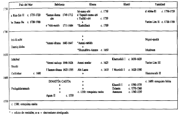 Tras la muerte de Hammurabi de Babilonia (aprox. 1750 a.C.), los posteriores soberanos babilónicos no consiguen mantener unido el imperio que se ha forjado. El primero en ocupar el trono es su hijo, Samsu-iluna (aprox. 1749-1712 a.C.), el cual tuvo que hacer frente a todas las rebeliones surgidas en ciudades y territorios conquistados y anexionados por Hammurabi, como Larsa, Eshnunna, o el «País del Mar«. Además, en los montes Zagros surge una nueva amenaza: los casitas, un pueblo montañés que estaba empezando a presionar el valle y que acabarán conquistando finalmente Babilonia para instalar su propia dinastía real, creando así la Babilonia casita. Después del largo y emprendedor reinado de Samsu-iluna de Babilonia, llegan al poder Abi-eshukh, Ammi-ditana y Ammi-saduqa (ver cronologías en la tabla de abajo).