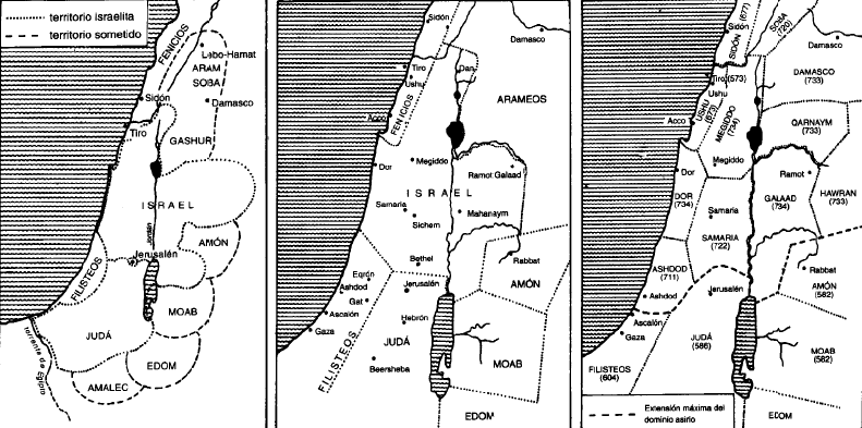 Palestina en el siglo X (izquierda), en los siglos IX-VIII (centro), y en los siglos VII y VI a.C. (derecha)