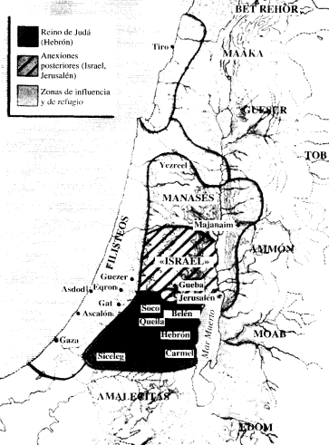 Sin embargo, este dominio durará poco. Las tribus del norte (Israel) reconocieron como rey a Ish-Ba´al, hijo de Saúl, mientras que el sur (Judá) es el núcleo de un nuevo reino formado por el rey David, probablemente en connivencia con los filisteos. Sin embargo, la situación cambia cuando muere Ish-Ba´al, ya que los ancianos de las tribus proponen a David que reine en todo Israel, coronándole en Hebrón. Los filisteos tienen una tardía e ineficaz respuesta y como consecuencia David los arrinconará en la costa, haciéndose con el control de las zonas de mayor presencia israelita.