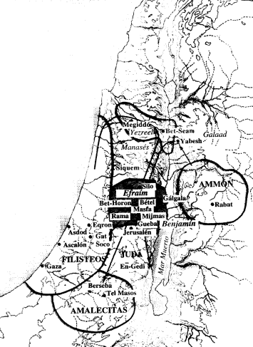 Mapa aproximado de la región de Palestina durante el reinado de Saúl (Fuente: Liverani, 2005)
