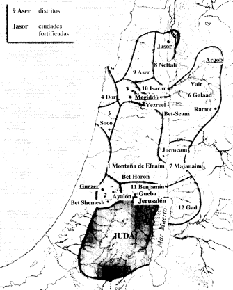 Mapa de los doce distritos financieros del reinado de Salomón (Fuente: Liverani, 2005)