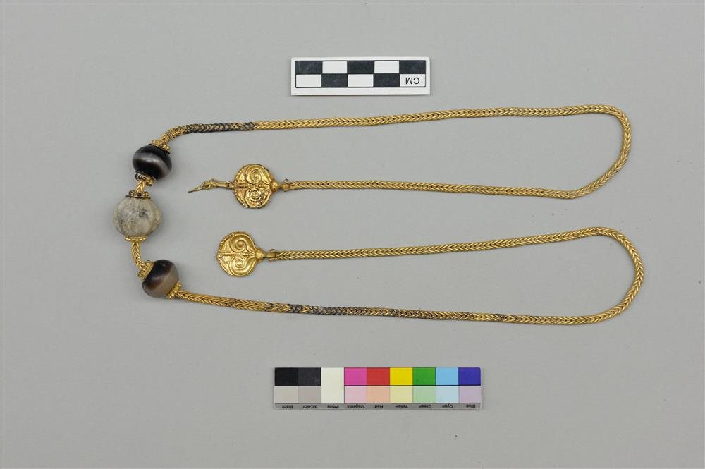 Collar de oro con dos colgantes hallado en una tumba micénica