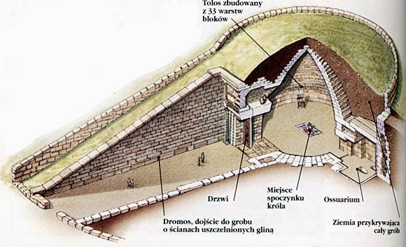 Poco antes de finalizar el siglo XVI a.C., las élites sociales micénicas comenzaron a adoptar un nuevo tipo de tumbas, los tholos, que representan las mayores grandezas arquitectónicas realizadas por los micénicos. Consistían en grandes cámaras de piedra en forma de colmena, excavadas en horizontal en el seno de un talud, a cuya sepultura abovedada y cámara ritual se llegaba a través de un largo pasillo de piedras apiladas y de una gran puerta de bronce, todo ello cubierto con un túmulo de tierra. Por desgracia, la mayoría de estas tumbas fueron saqueadas hace muchos siglos, aunque nos han llegado intactas unas pocas, a través de las cuales tenemos unos ajuares funerarios incluso más numerosos y ostentosos que los de las tumbas de fosa.