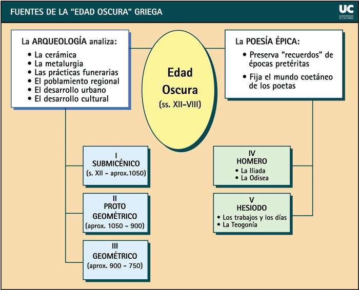 A nivel cronológico, la Edad Oscura griega se divide en dos periodos: una primera mitad (1150-900 a.C., aprox.) en la que Grecia fue víctima frecuente de invasiones y movimientos de población, aunque se ven algunas pruebas de la paulatina recuperación y evolución material; y una segunda mitad (900-750 a.C., aprox.) en la que se va produciendo una lenta aceleración del progreso que sienta las bases del renacimiento cultural del siglo VIII a.C.