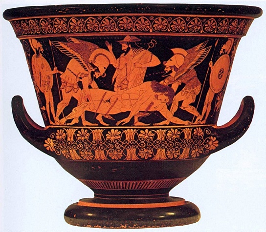 Pieza cerámica de figuras rojas de temática mitológica, muestra del arte de la Grecia arcaica