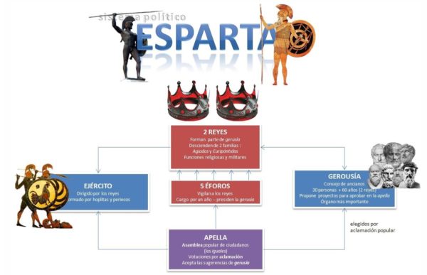 Esparta fue la ciudad más poderosa de la Antigua Grecia durante buena parte de los períodos arcaico y clásico, al ser admirada en tiempos de paz y temida en tiempos de guerra. Esto era en parte porque era diferente de las otras polis. Compartían una serie de instituciones y valores con el resto del mundo griego, como la sociedad patriarcal y politeísta, la mano de obra servil, la agricultura como base de su economía…, pero se diferenciaban en muchos otros aspectos, como en la gigantesca intervención estatal en la vida de los ciudadanos espartanos. Esta interferencia existía en todos los estados griegos, pero en ninguno de manera tan intensa como en Esparta. Veamos ahora cómo eran las instituciones de gobierno de Esparta.