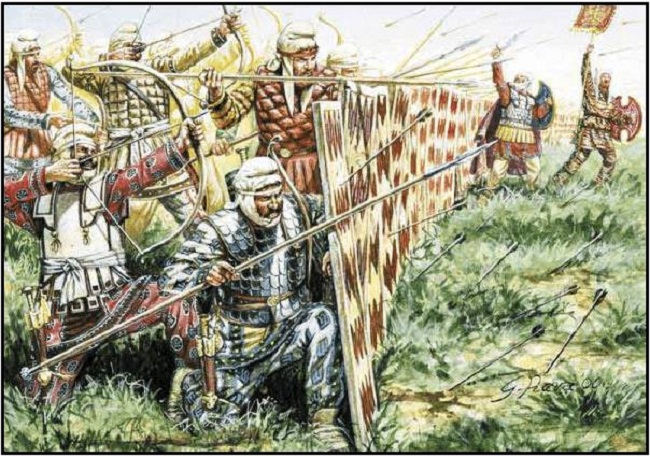No se limitaban a disparar. Las batallas en Asia se libraban con un fiero intercambio de flechas, y cuando éstas se acababan, llegaban al cuerpo a cuerpo, entablando combates a veces feroces. Sobre la batalla, en la que murió Ciro, contra los escitas de la reina Tomiris, Herodoto escribió: «De las batallas luchadas entre los bárbaros, aquella fue la más sangrienta, y se desarrolló así: primero inundaron el aire con sus flechas, y, cuando éstas se acabaron, se atacaron con lanzas, cuchillos y hachas …«