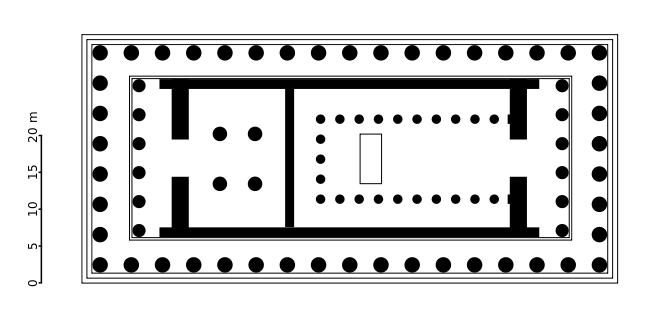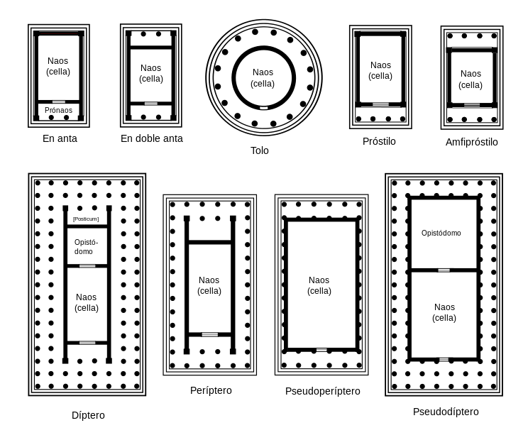 Las demás características técnicas son formas de clasificar su planta. El Partenón es un templo períptero, lo que significa que está completamente rodeado por columnas. También es un templo octástilo, es decir, que tiene una fachada con ocho columnas. Por último, decimos que es un templo anfipróstilo porque cuenta con dos pórticos, uno en cada extremo del edificio. Cada uno de estos pórticos es hexástilo, porque cuenta con una fachada de seis columnas.