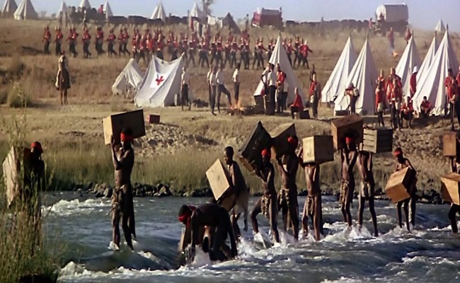La segunda parte sería la invasión de Zululandia atravesando el río Búfalo -en una espectacular escena a ritmo de Bernstein rodada en el lugar original-, las primeras escaramuzas con zulúes aislados (no se muestra el ataque al kraal de Sihayo, en el que resultaron heridos los que luego tendrían que defender Rorke’s Drift), los choques personales entre Lord Chelmsford y Dunford, la acampada a los pies de la colina de Issandhlwana y la marcha de la columna del general en busca de un ejército zulú al que no hay forma de localizar; en suma, todo lo que antecedió a la batalla.
