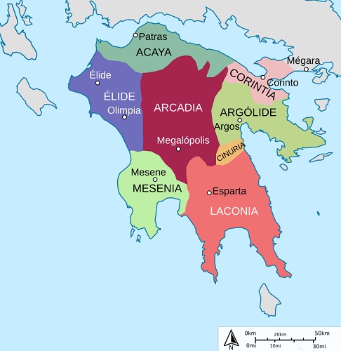 Mapa de la península del Peloponeso y sus principales regiones y ciudades
