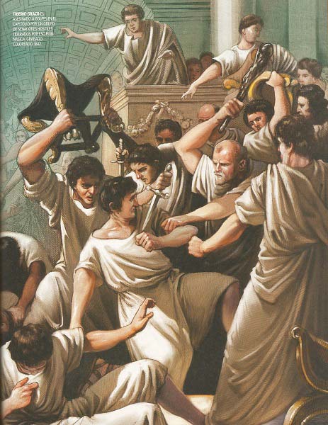 Gracias al historiador Plutarco (s. I d.C.) sabemos con detalle cómo fue el día de junio del 133 a.C. en que se produjo la muerte de Tiberio Graco. Cuando la asamblea popular estaba reunida en el Capitolio para las elecciones, el lugar fue asaltado por un grupo de senadores y hombres armados con palos y mazas. Los lideraba Publio Cornelio Escipión Nasica Serapio, un primo de Tiberio Graco que había sido cónsul en el 138 a.C. y que ahora en el 133 a.C. era pontífice máximo, uno de los máximos cargos sacerdotales de Roma.