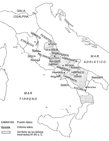 Cuando hablamos de la Guerra de los Aliados, Guerra Social o Guerra Mársica no debemos pensar que fue algo así como todos los pueblos de Italia contra Roma, ni mucho menos. Concretamente, los pueblos itálicos que se rebelaron contra los romanos fueron los samnitas, los picenos, los marsos, los vestinos, los pelignos, los marrucinos, los frentanos y los hirpinos. Todos ellos formaron un bloque compacto en un amplio territorio de la Italia central y meridional, con particular fuerza en torno a los Apeninos y la costa adriática. No obstante, cabe destacar que algunas ciudades dentro de los territorios rebelados prefirieron mantenerse al margen del conflicto.