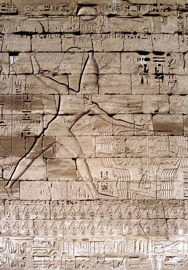 Relieve de Ramsés III derrotando a sus enemigos en Medinet Habu