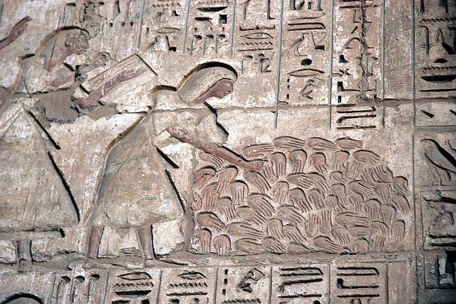 Relieve del templo de Medinet Habu en el que se ven todas las manos amputadas por Ramsés III a sus enemigos