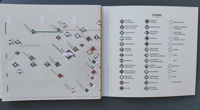 Cada uno de estos iconos está acompañado de dos elementos más: un borde de hasta once colores combinables diferentes y un número del 1 al 62. El primero equivale a los distintos países o grupos de países que se vieron implicados en la segunda guerra mundial; el segundo es el código que hay que seguir para localizar el acontecimiento en el reverso de la infografía, que contiene la parte textual que explica un poco qué pasó en esa fecha determinada.